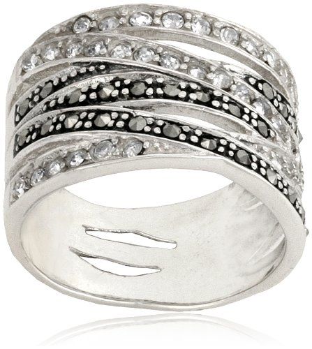 Sterling Silver 6-Row Marcasite and Crystal Ring, Size 8...